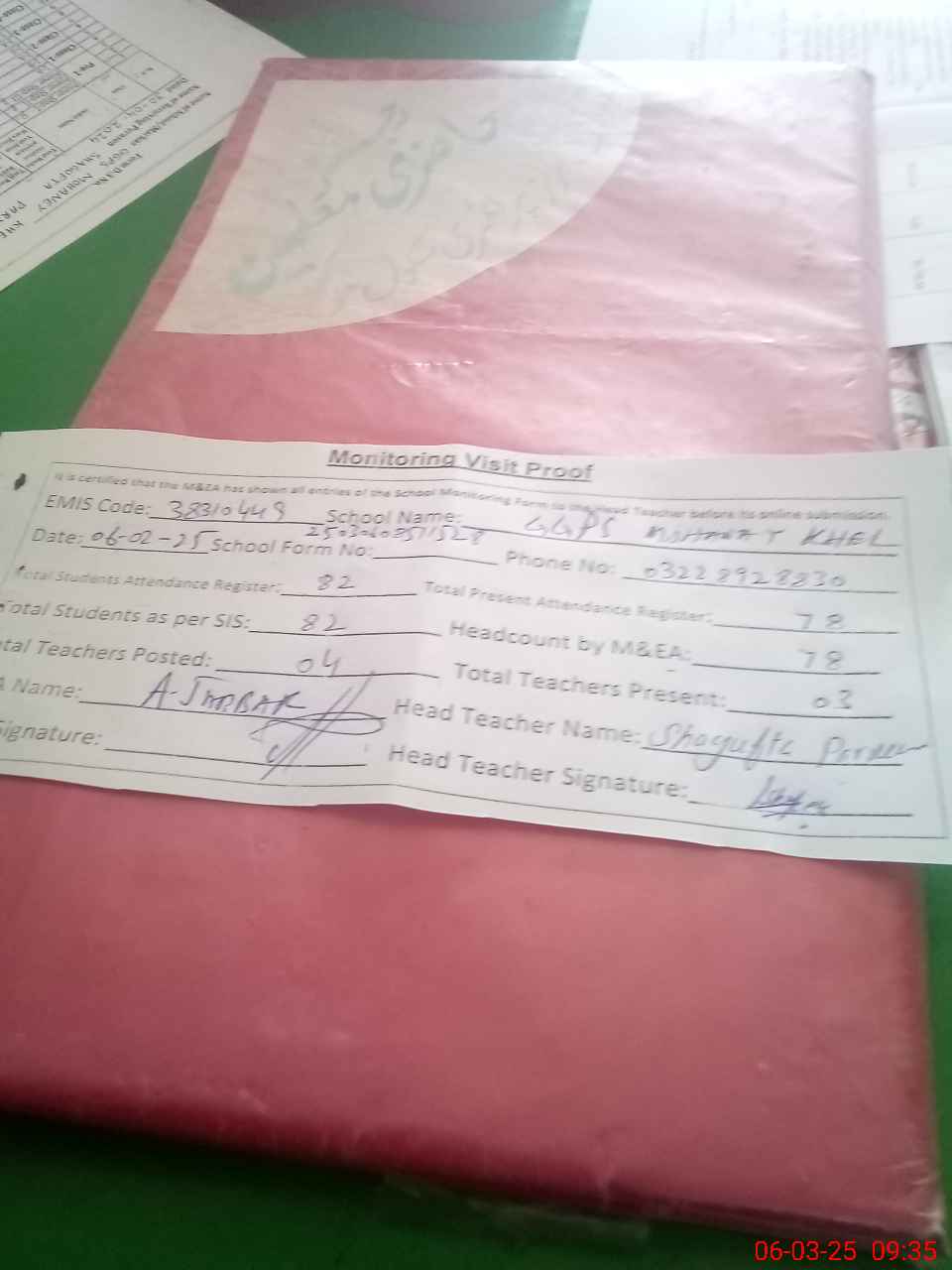 | Attendance Register | Head Teacher | MEA with School | Visit Proof |