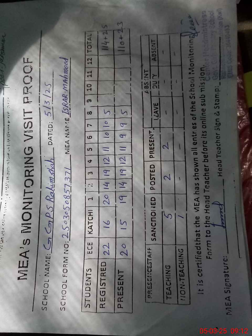 | Attendance Register | Head Teacher | MEA with School | Visit Proof |