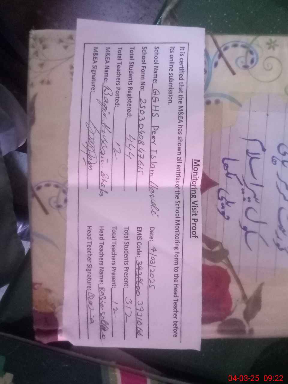 | EMIS Code: 39310616 | Name of School: GGHS PIR ISLAM | |||