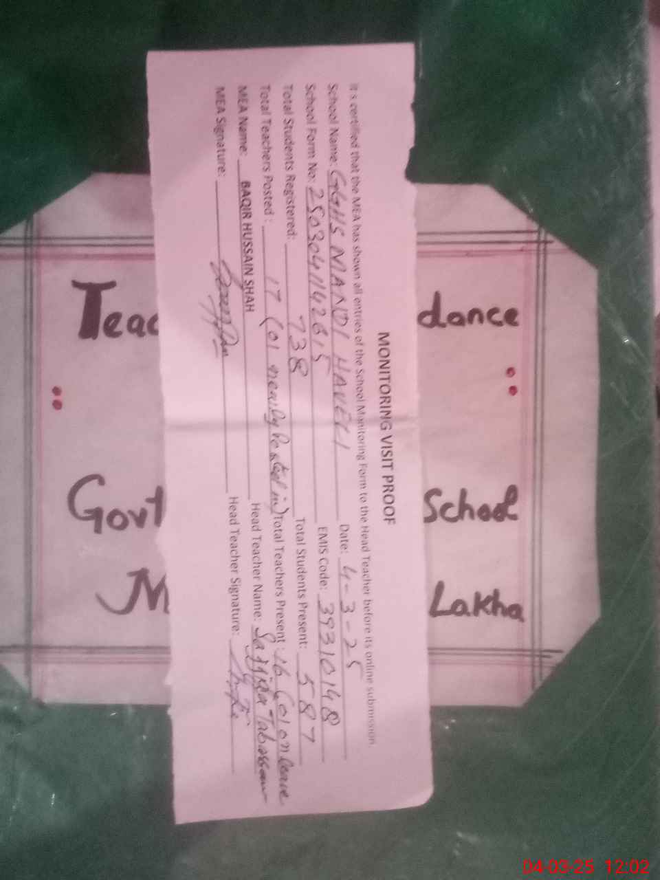 | Attendance Register | Head Teacher | MEA with School | Visit Proof |
