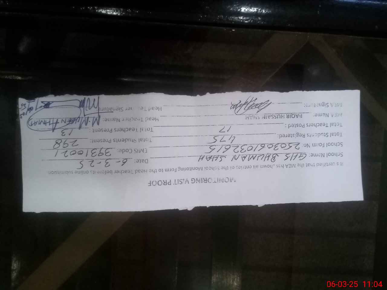 | Attendance Register | Head Teacher | MEA with School | Visit Proof |