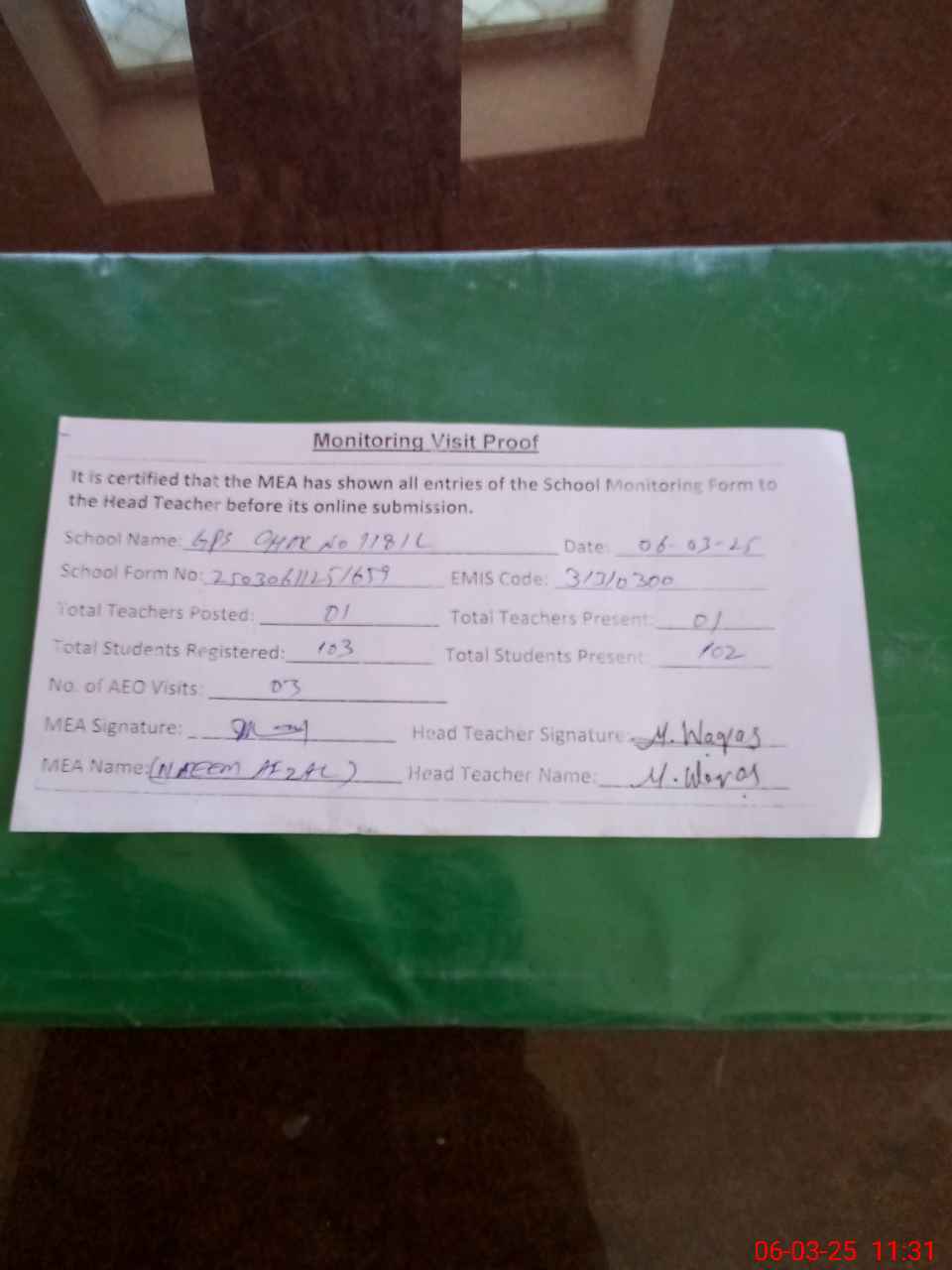 | Attendance Register | Head Teacher | MEA with School | Visit Proof |