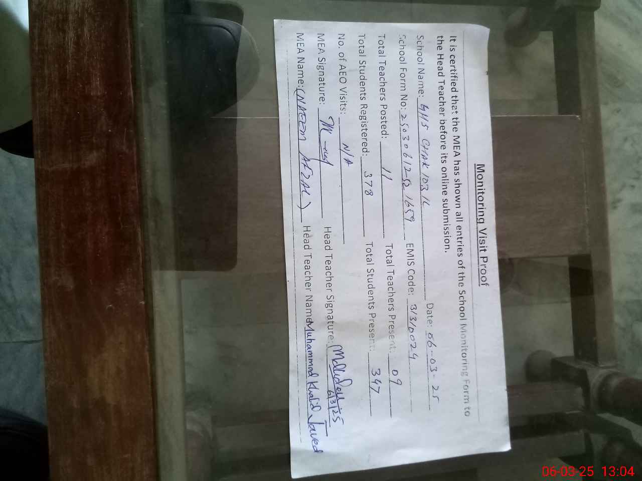 | Attendance Register | Head Teacher | MEA with School | Visit Proof |