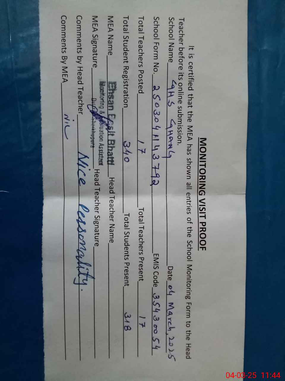 | Attendance Register | Head Teacher | MEA with School | Visit Proof |