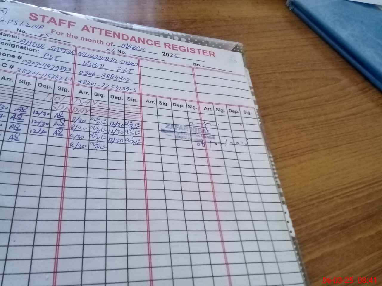| CNIC | Full Name | Designation | R/C | Absence during last cal. month |