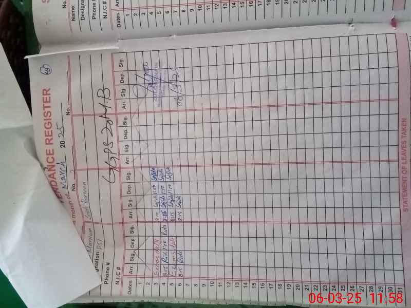 | CNIC | Full Name | Designation | R/C | Absence During Last Calender Month |