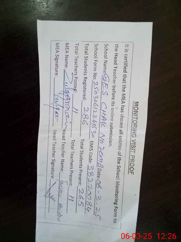 | EMIS Code: 38220084 | Name of School: GES CHAK NO. 20/MB | |||