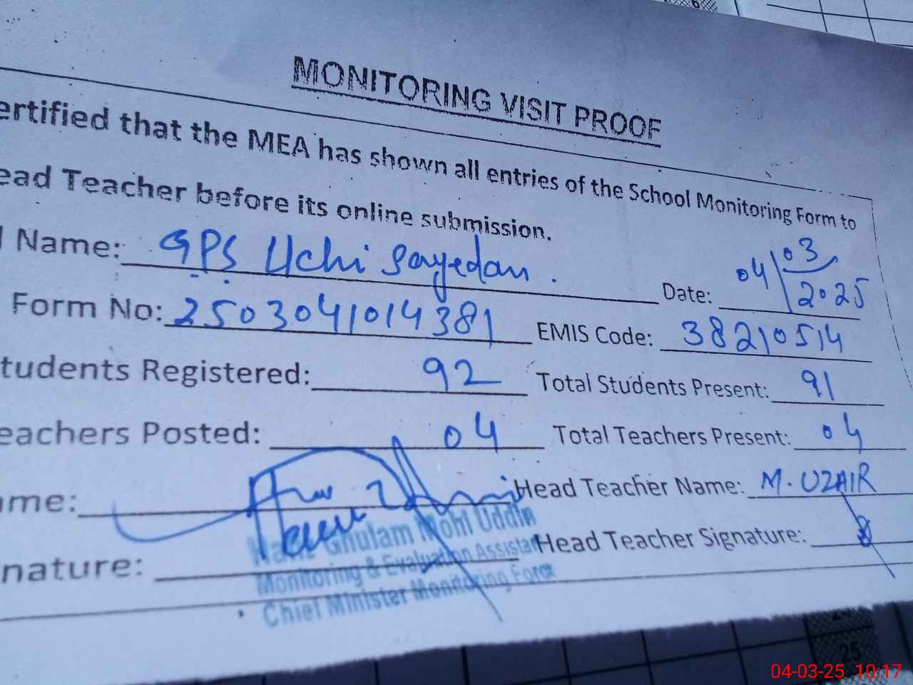 | Attendance Register | Head Teacher | MEA with School | Visit Proof |