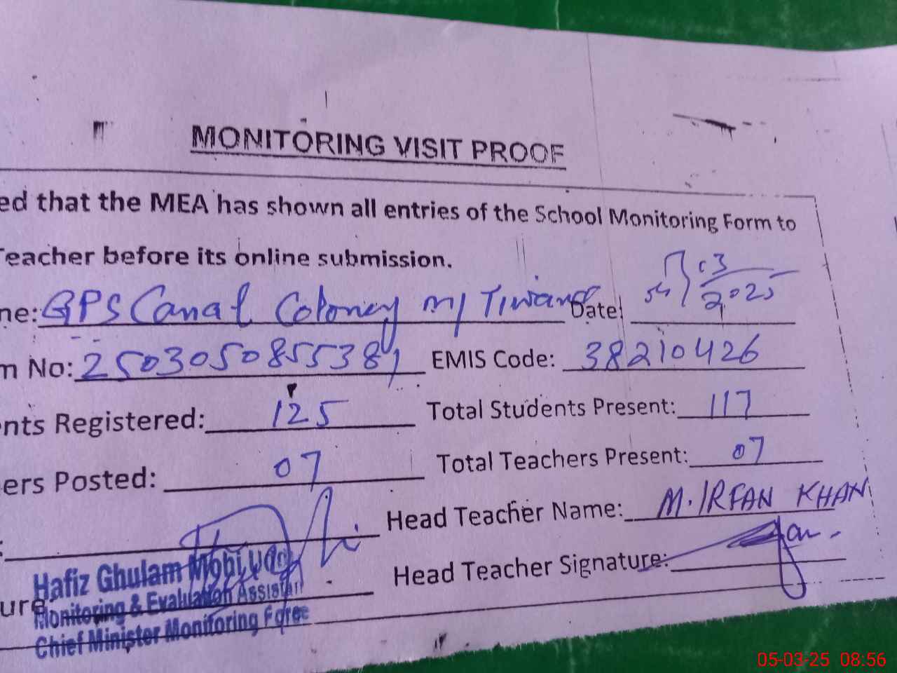| EMIS Code: 38210426 | Name of School: GPS CANAL COLONY MITHA TIWANA | |||