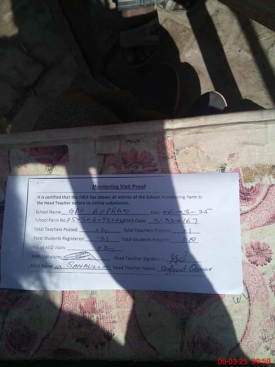 | Attendance Register | Head Teacher | MEA with School | Visit Proof |