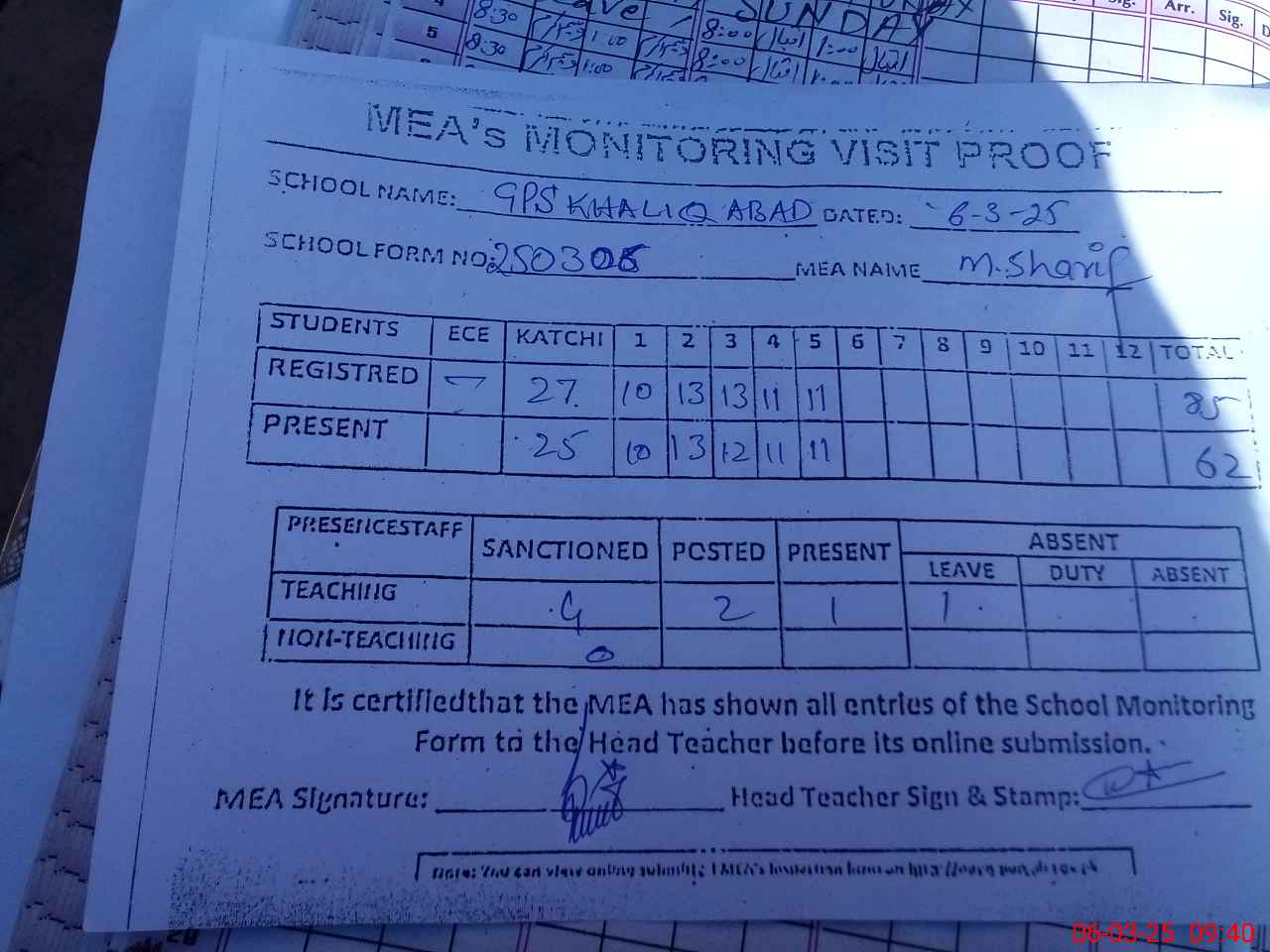 | Attendance Register | Head Teacher | MEA with School | Visit Proof |