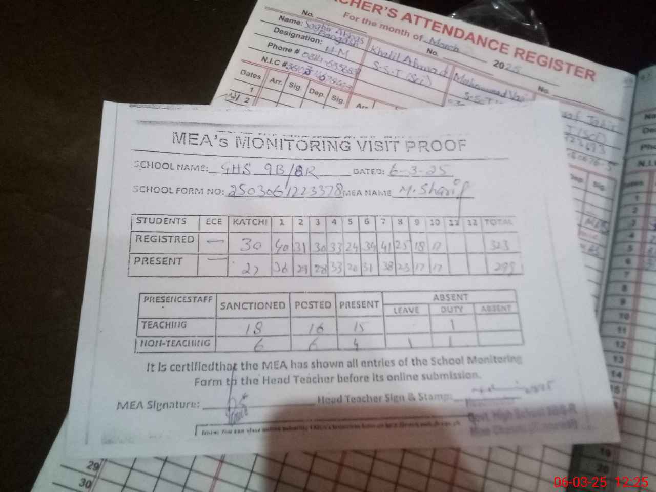 | Attendance Register | Head Teacher | MEA with School | Visit Proof |