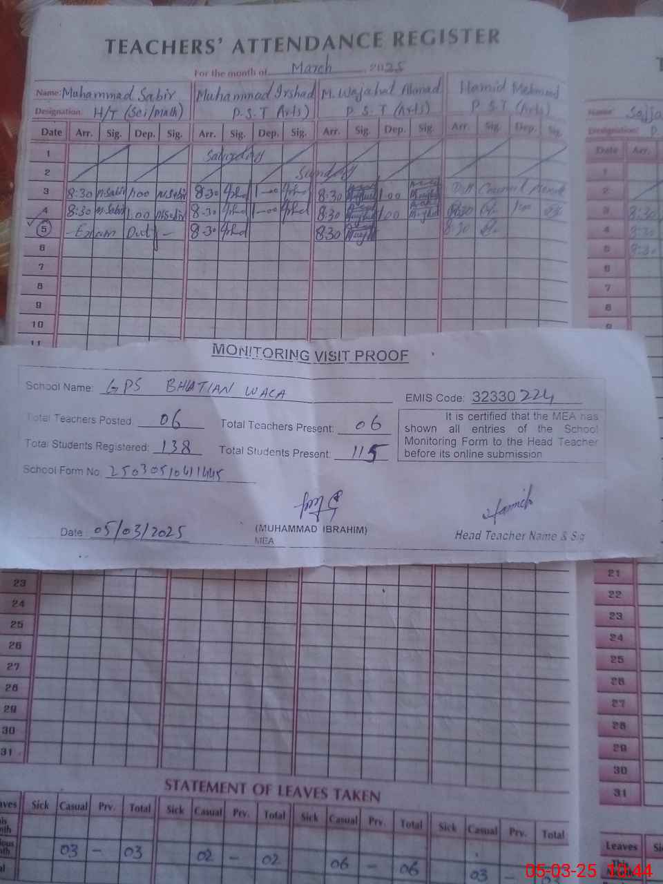 | Attendance Register | Head Teacher | MEA with School | Visit Proof |