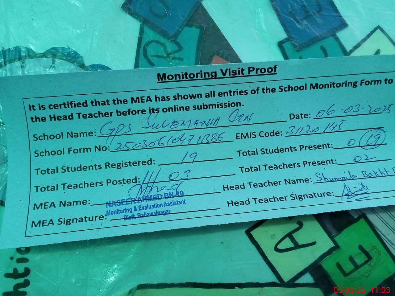 | EMIS Code: 31120145 | Name of School: GPS SULEMANIA CHISHTIAN | |||