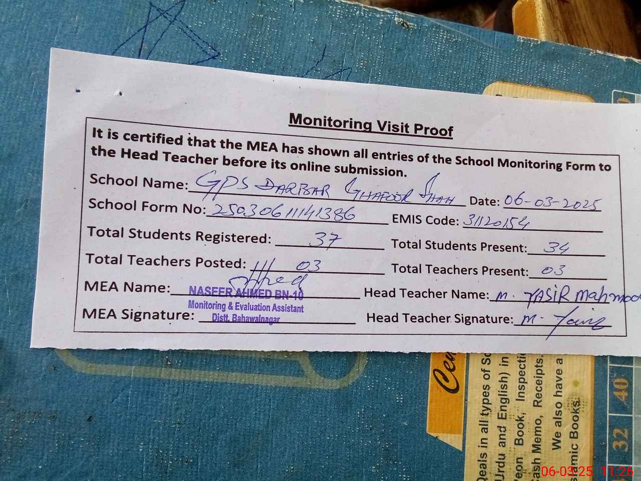 | Attendance Register | Head Teacher | MEA with School | Visit Proof |