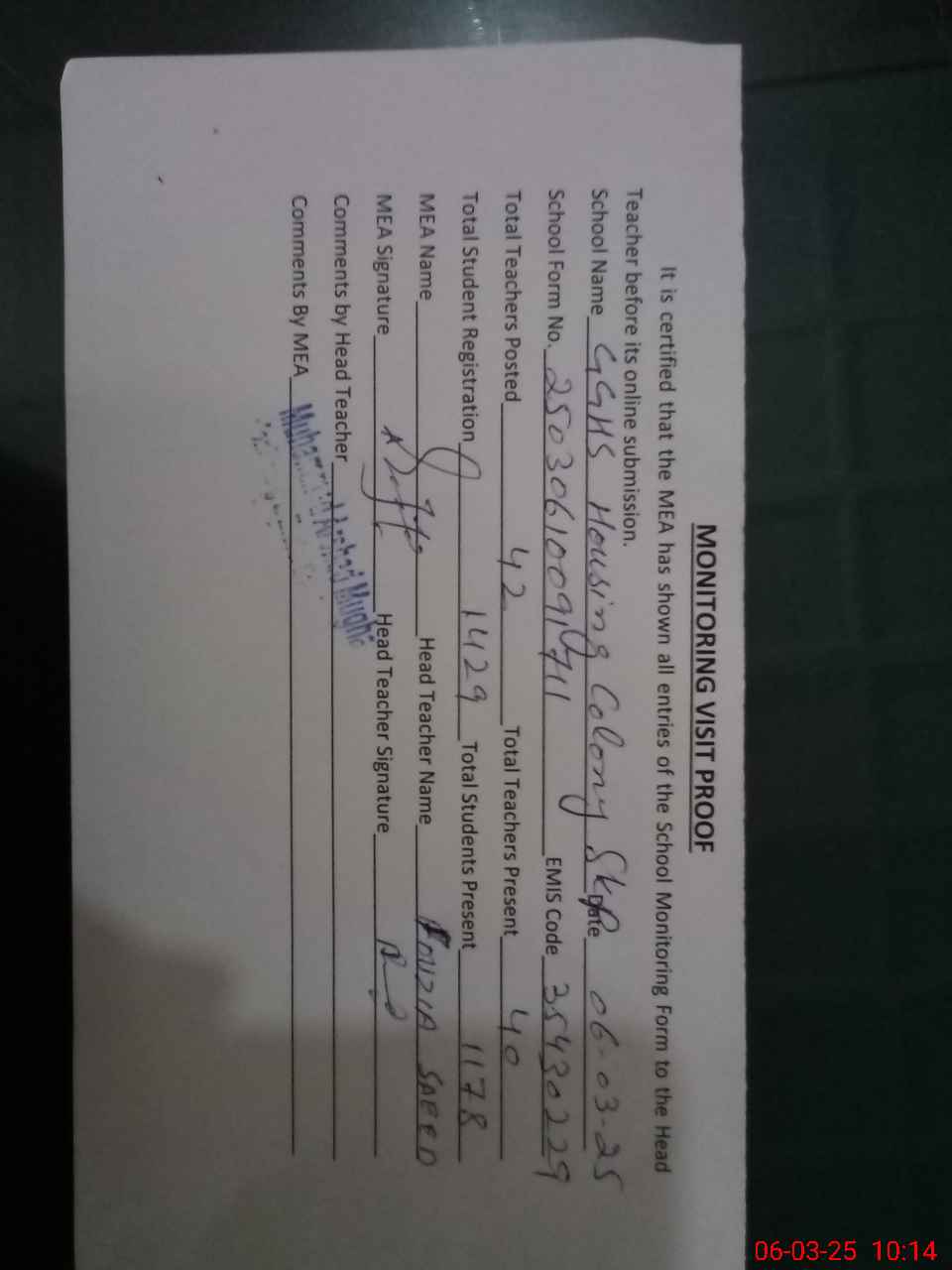 | Attendance Register | Head Teacher | MEA with School | Visit Proof |