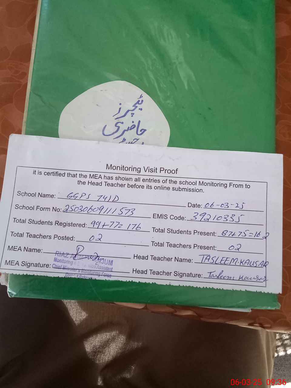 | Attendance Register | Head Teacher | MEA with School | Visit Proof |