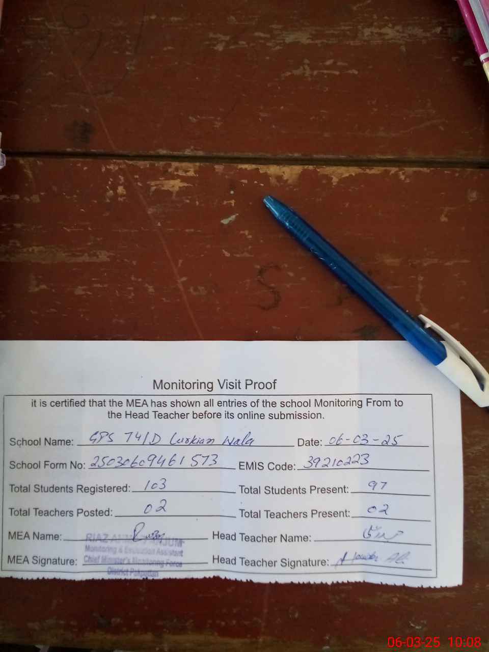 | Attendance Register | Head Teacher | MEA with School | Visit Proof |