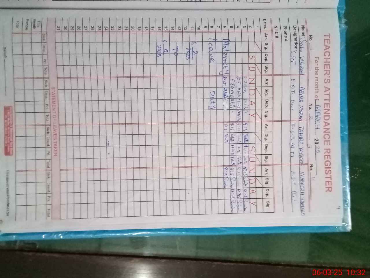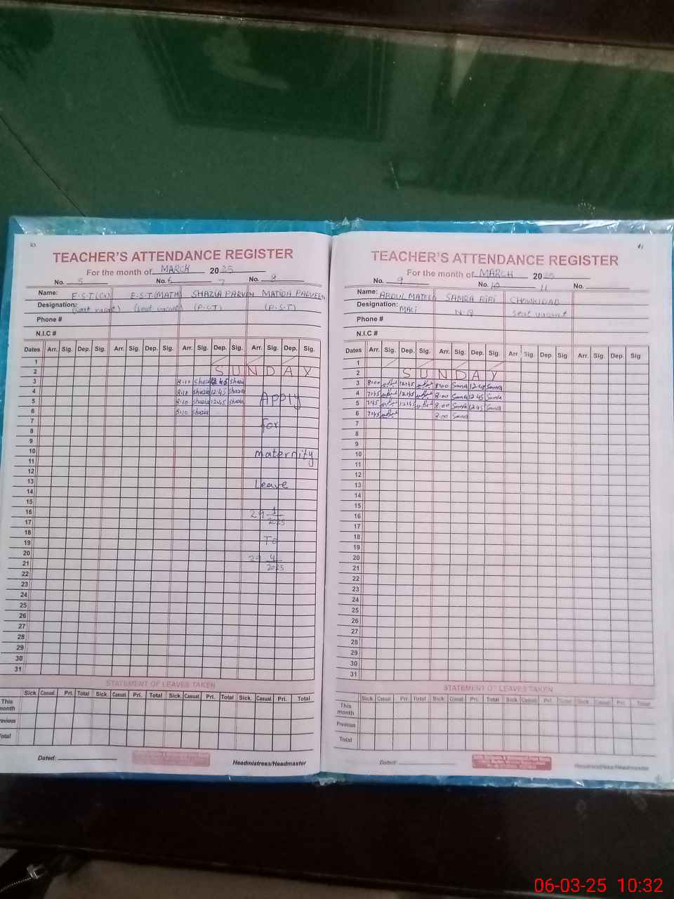 | 31**** | Ma**** Na**** | PST | Regular | 0 | 0 | 0 | 0 | 0 | 0 | 0 | 0 | 0 | Maternity |