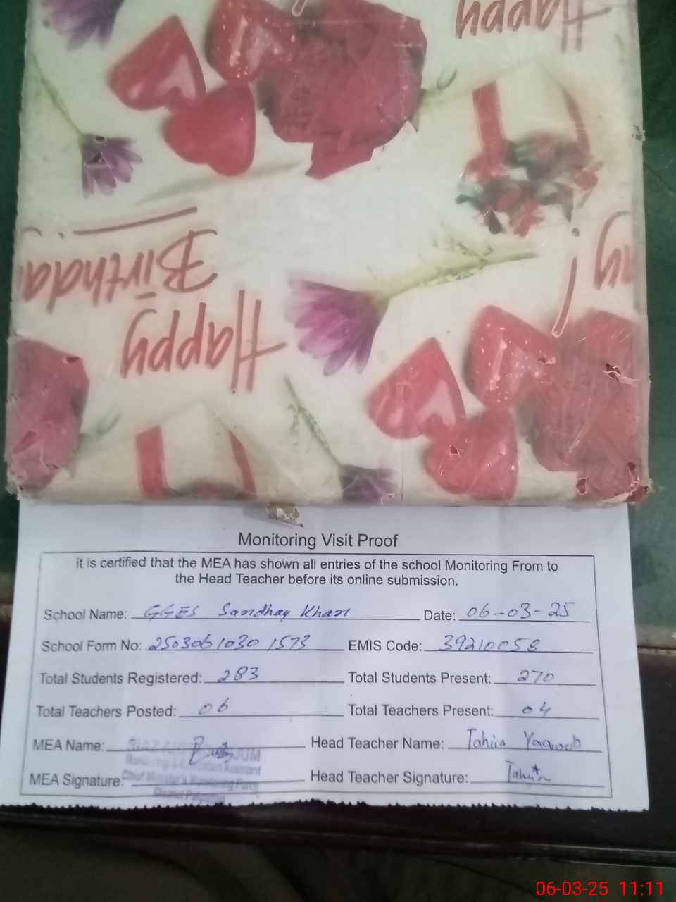| Attendance Register | Head Teacher | MEA with School | Visit Proof |