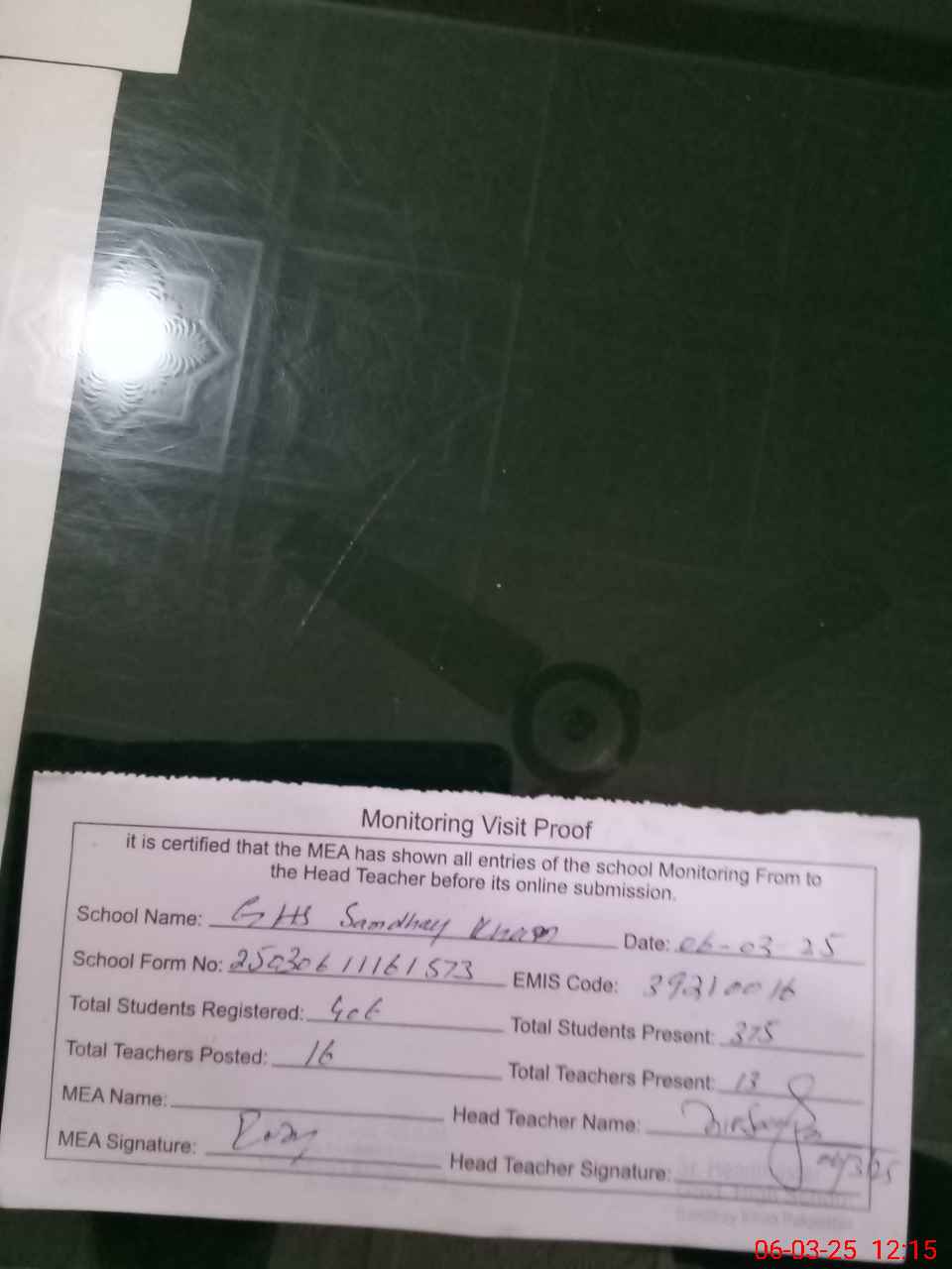 | Attendance Register | Head Teacher | MEA with School | Visit Proof |