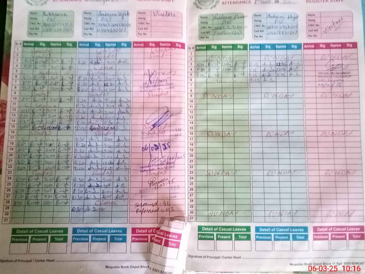 | CNIC | Full Name | Designation | R/C | Absence During Last Calender Month |