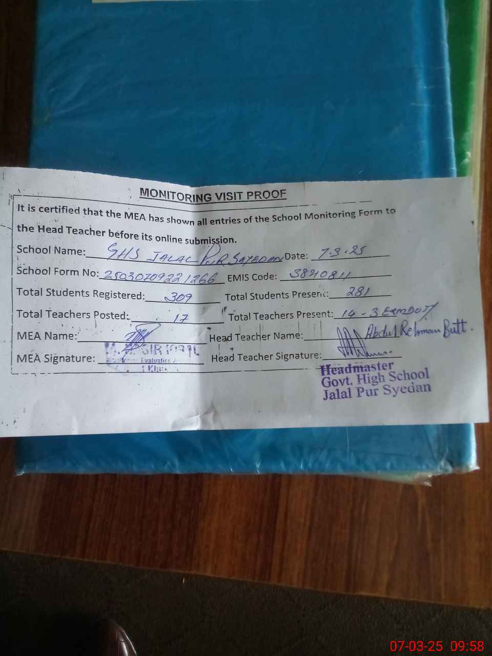 | EMIS Code: 38210811 | Name of School: GHS JALAL PUR SAYEDAN | |||