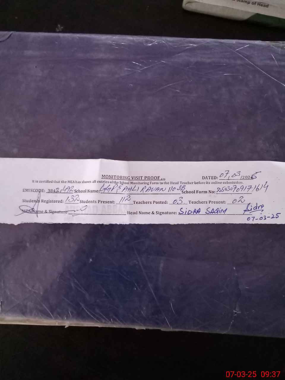 | Attendance Register | Head Teacher | MEA with School | Visit Proof |