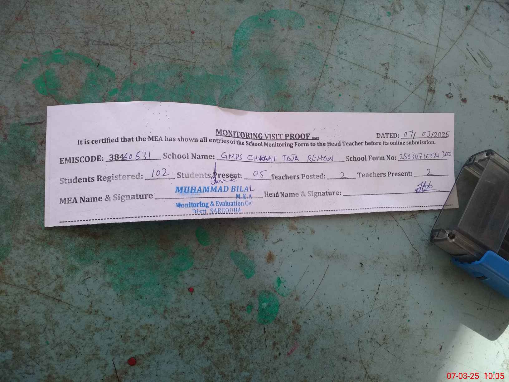 | Attendance Register | Head Teacher | MEA with School | Visit Proof |