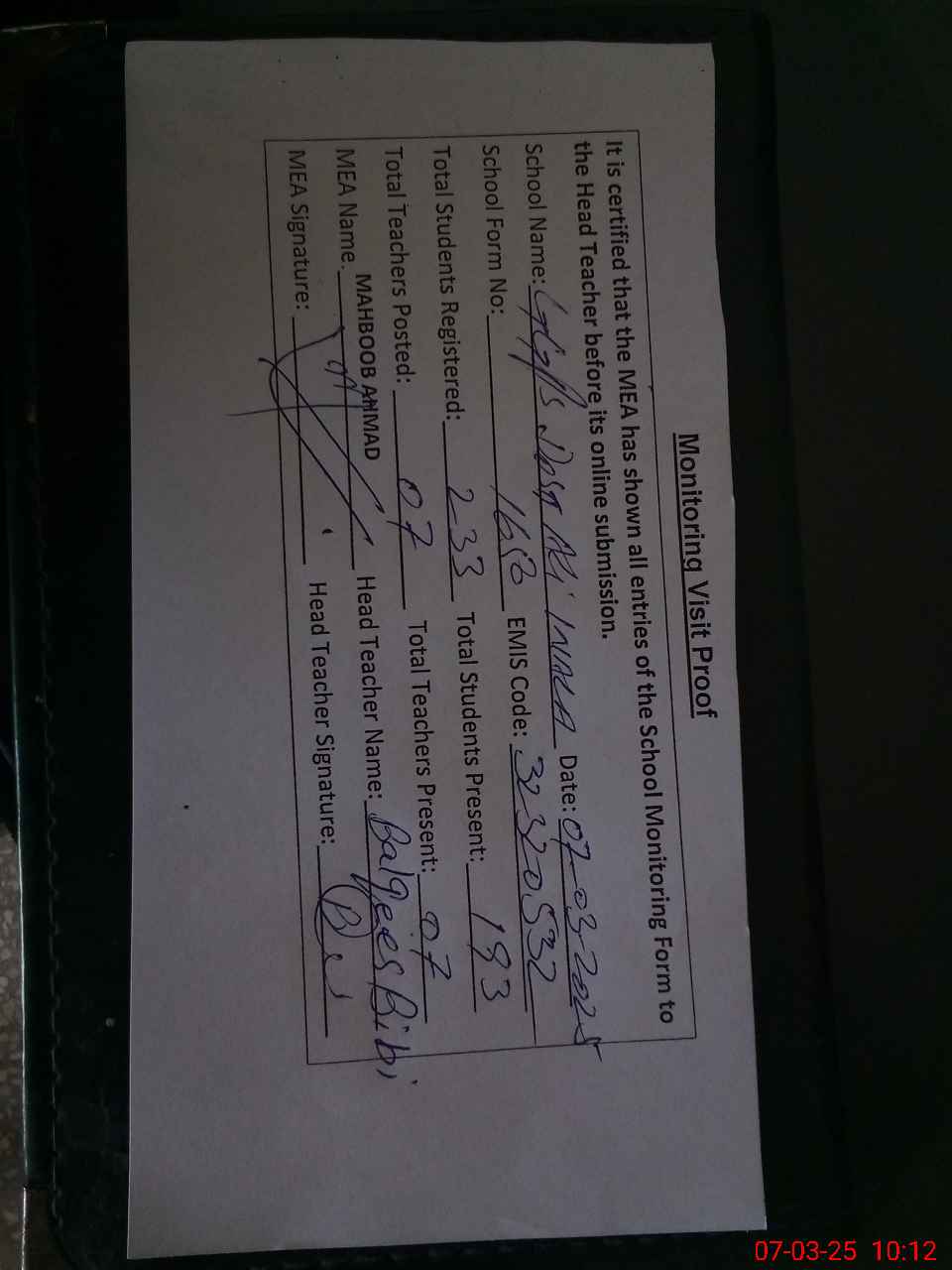 | Certified that this School was Inspected by the Undersigned MEA/DMO Today and the Information Stated Above is as Per Record. | |||||