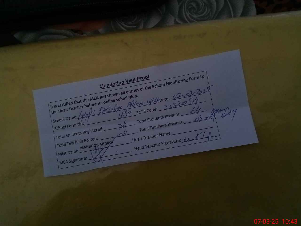 | Certified that this School was Inspected by the Undersigned MEA/DMO Today and the Information Stated Above is as Per Record. | |||||