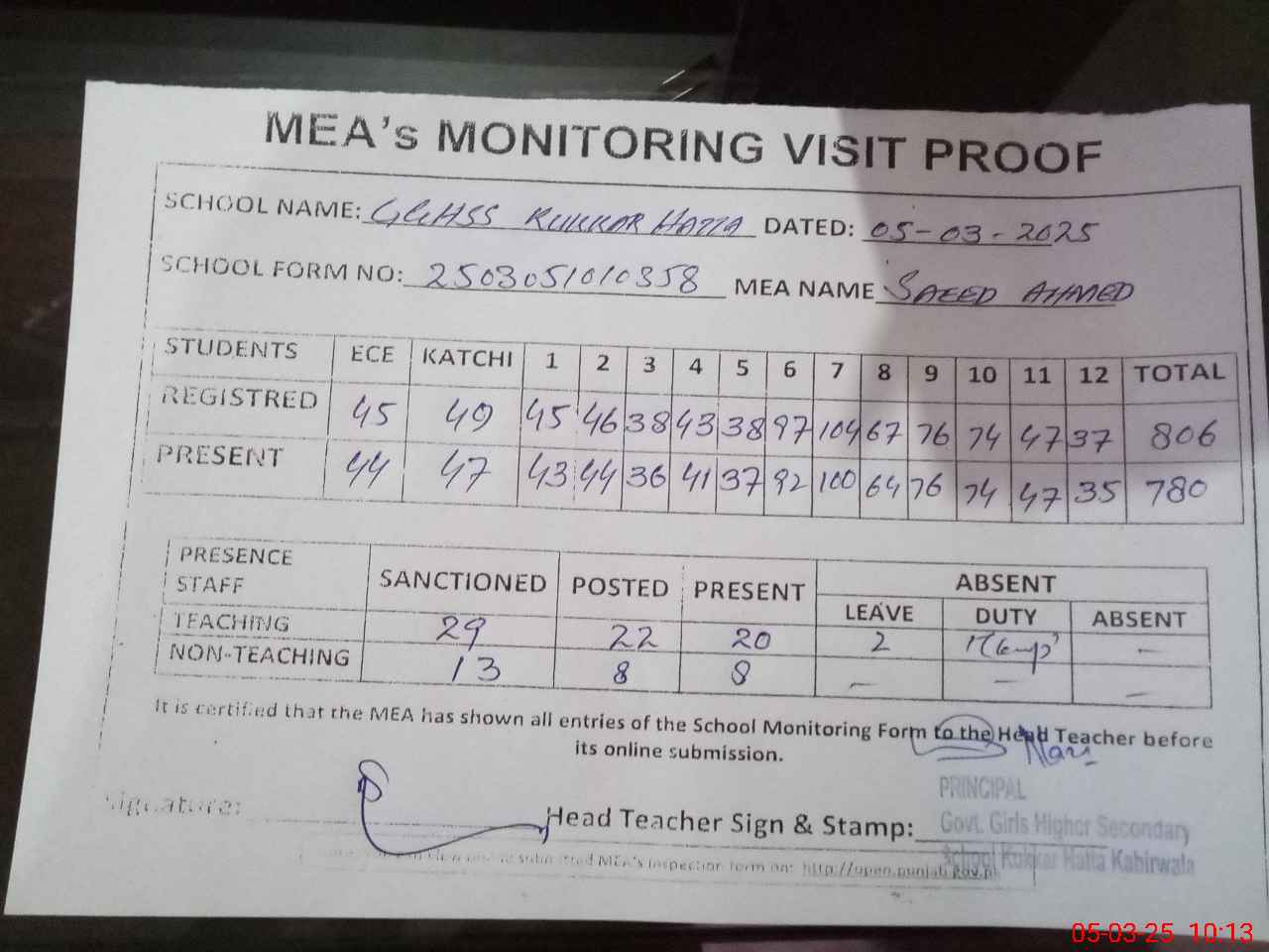 | EMIS Code: 36410092 | Name of School: GGHSS KUKKAR HATTA, KABIRWALA | |||