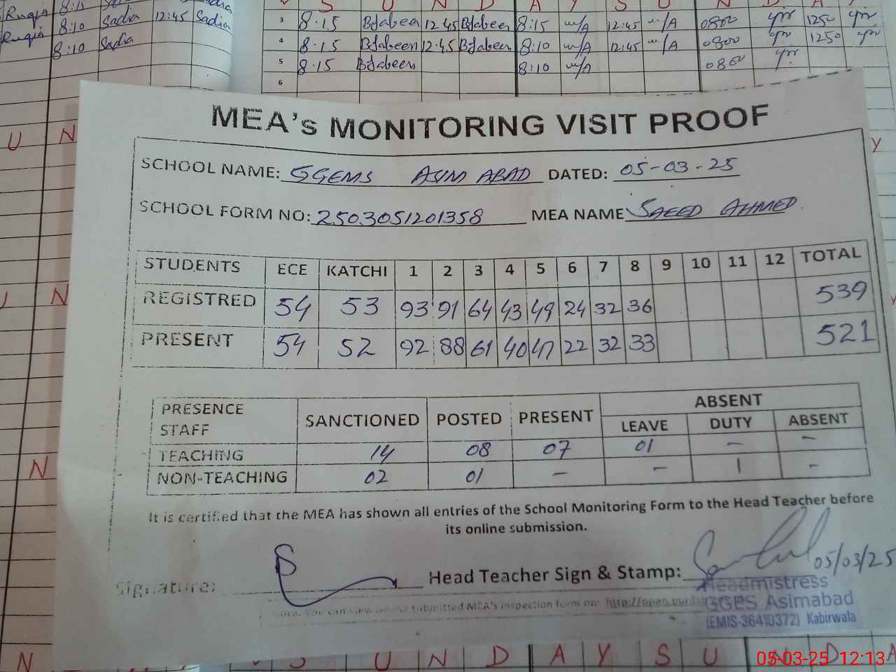 | Attendance Register | Head Teacher | MEA with School | Visit Proof |