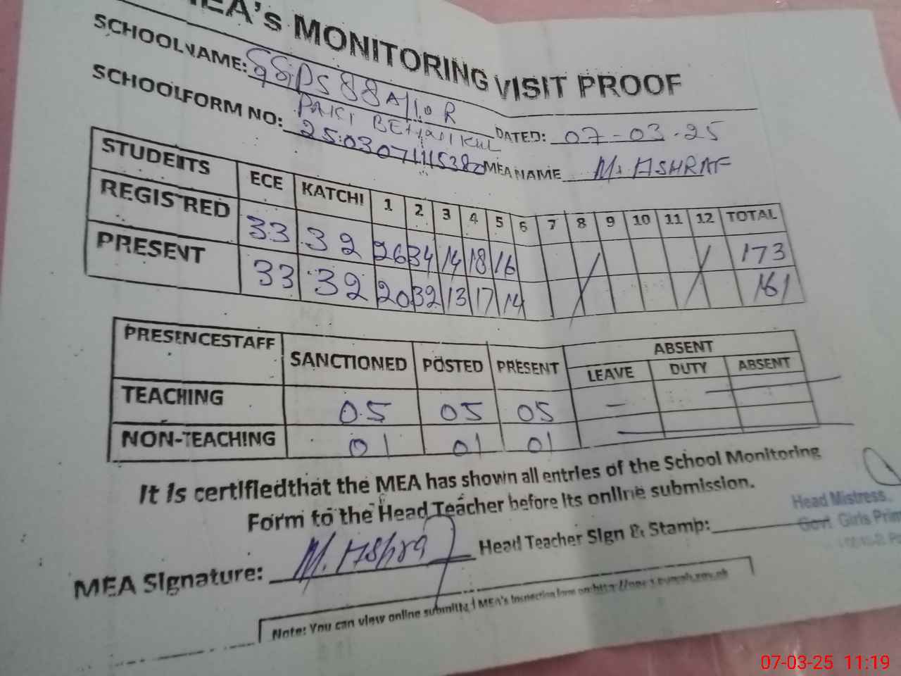 | Attendance Register | Head Teacher | MEA with School | Visit Proof |