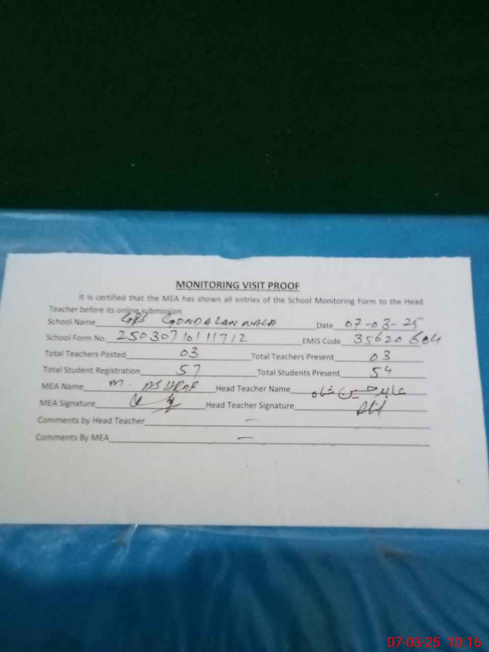 | Attendance Register | Head Teacher | MEA with School | Visit Proof |