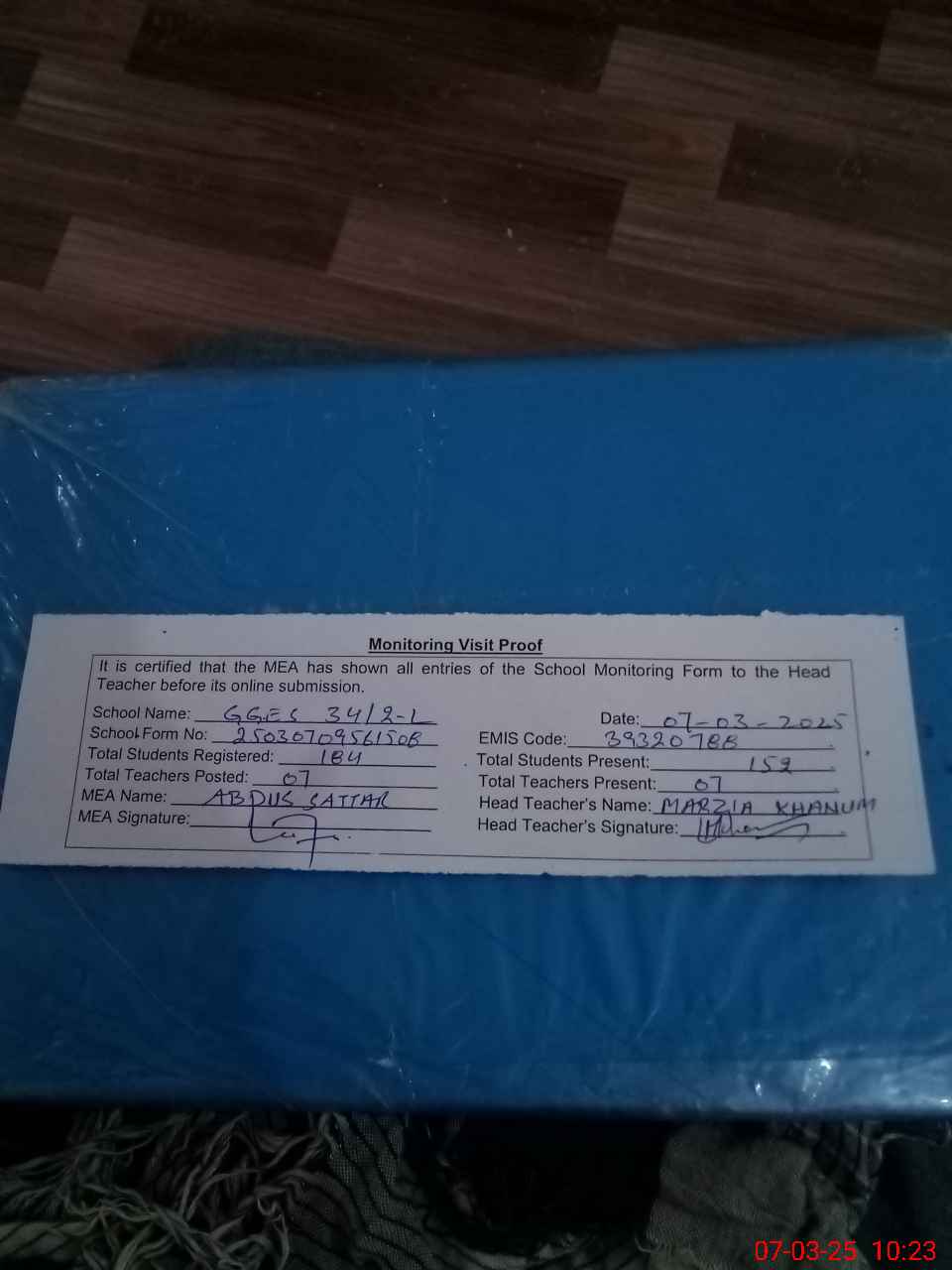 | Attendance Register | Head Teacher | MEA with School | Visit Proof |
