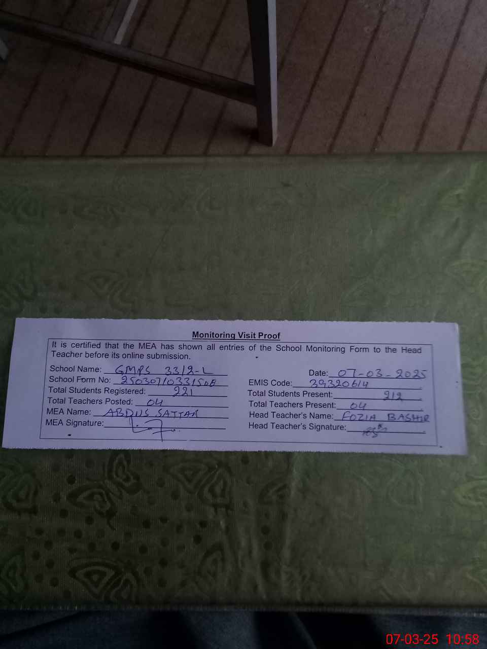 | Certified that this School was Inspected by the Undersigned MEA/DMO Today and the Information Stated Above is as Per Record. | |||||