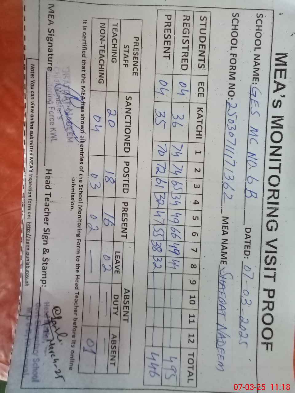 | EMIS Code: 36420061 | Name of School: GES MC NO.6-B, RAILWAY COLONY, KHANEWAL | |||