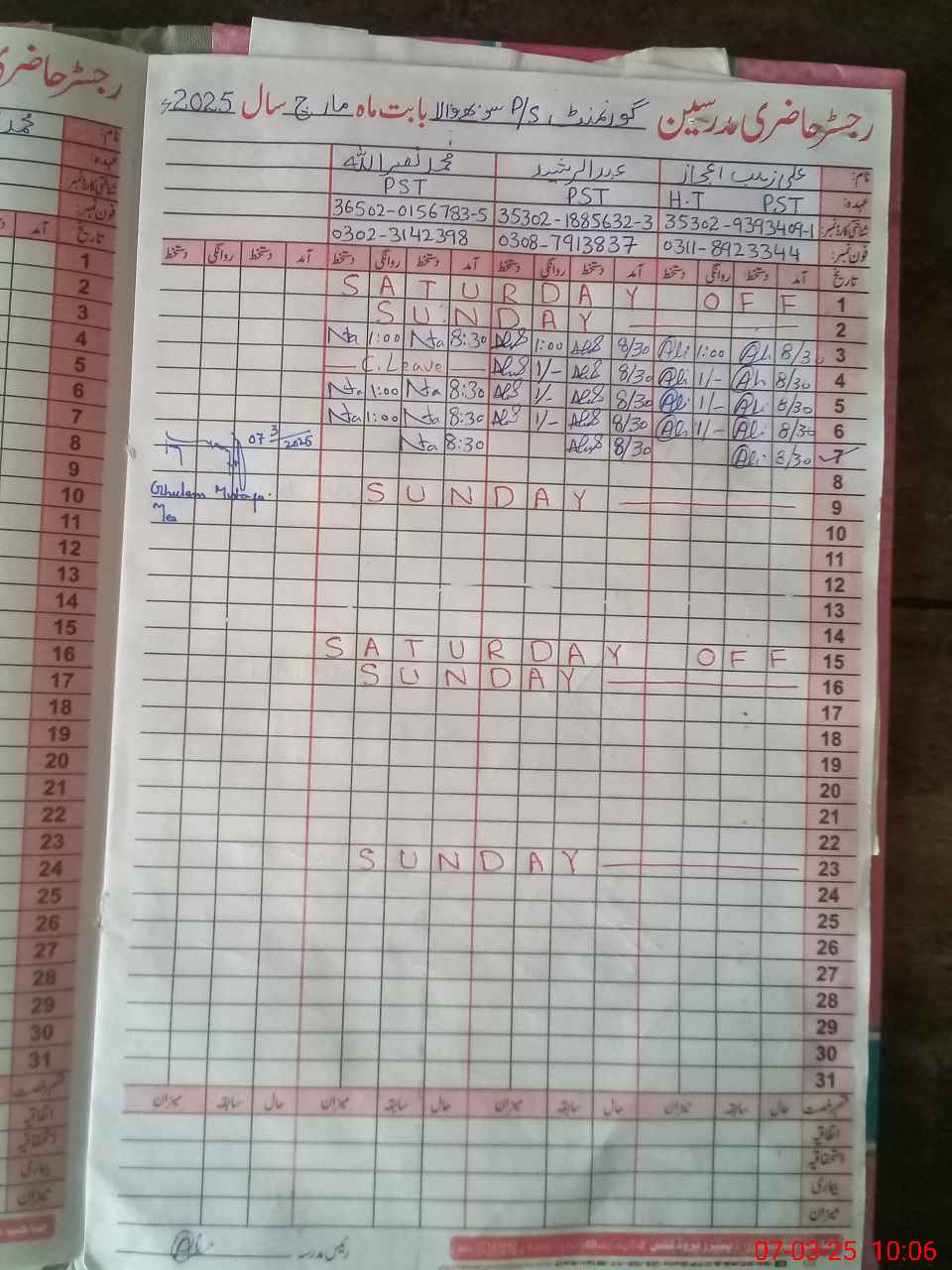 | Total no. of Classrooms: 4 No. of Classrooms Used for Teaching: 4 No. of Classrooms Storing Old Furniture, FTBs, etc: 0Comments if Any: Nominal roll for online attendance found contrary to current students records All enrolled students provided with free taxtbooks accordingly It is intimated that teacher Mehmood Anwar is attached with CEO office since May 2024 Submitted for information |