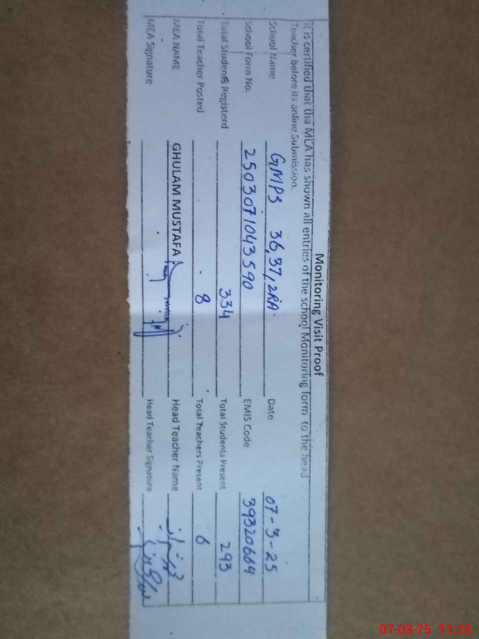 | Name: MU**** SH**** Designation: (School Headmaster's/Headmistress's) PST Phone/Cell Number: 03**** |