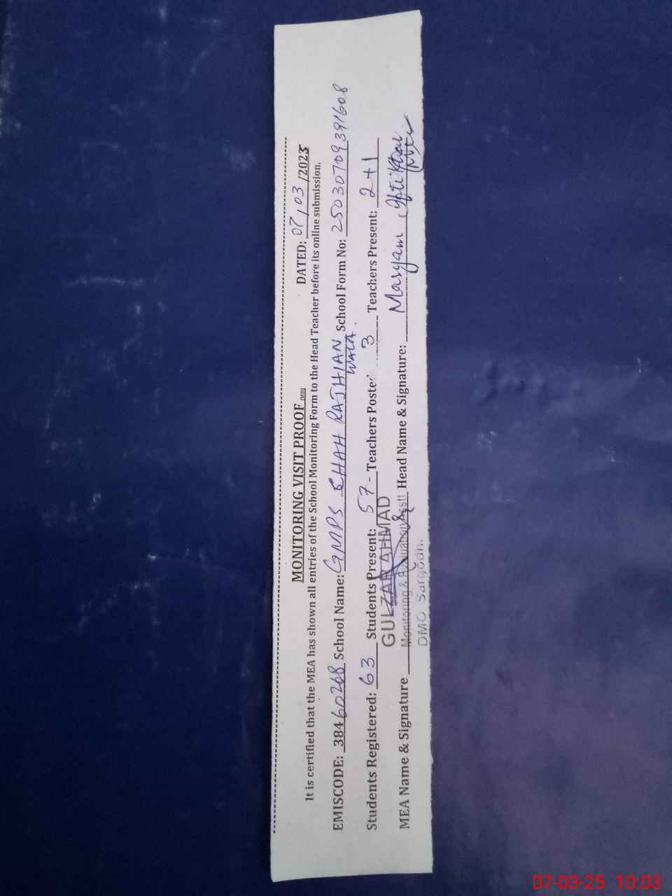 | Monitoring Date: 07-03-2025 | Start Time: 07-03-2025 09:39 AM | End Time: 07-03-2025 10:15 AM | Name of MEA: GU**** AH**** | |