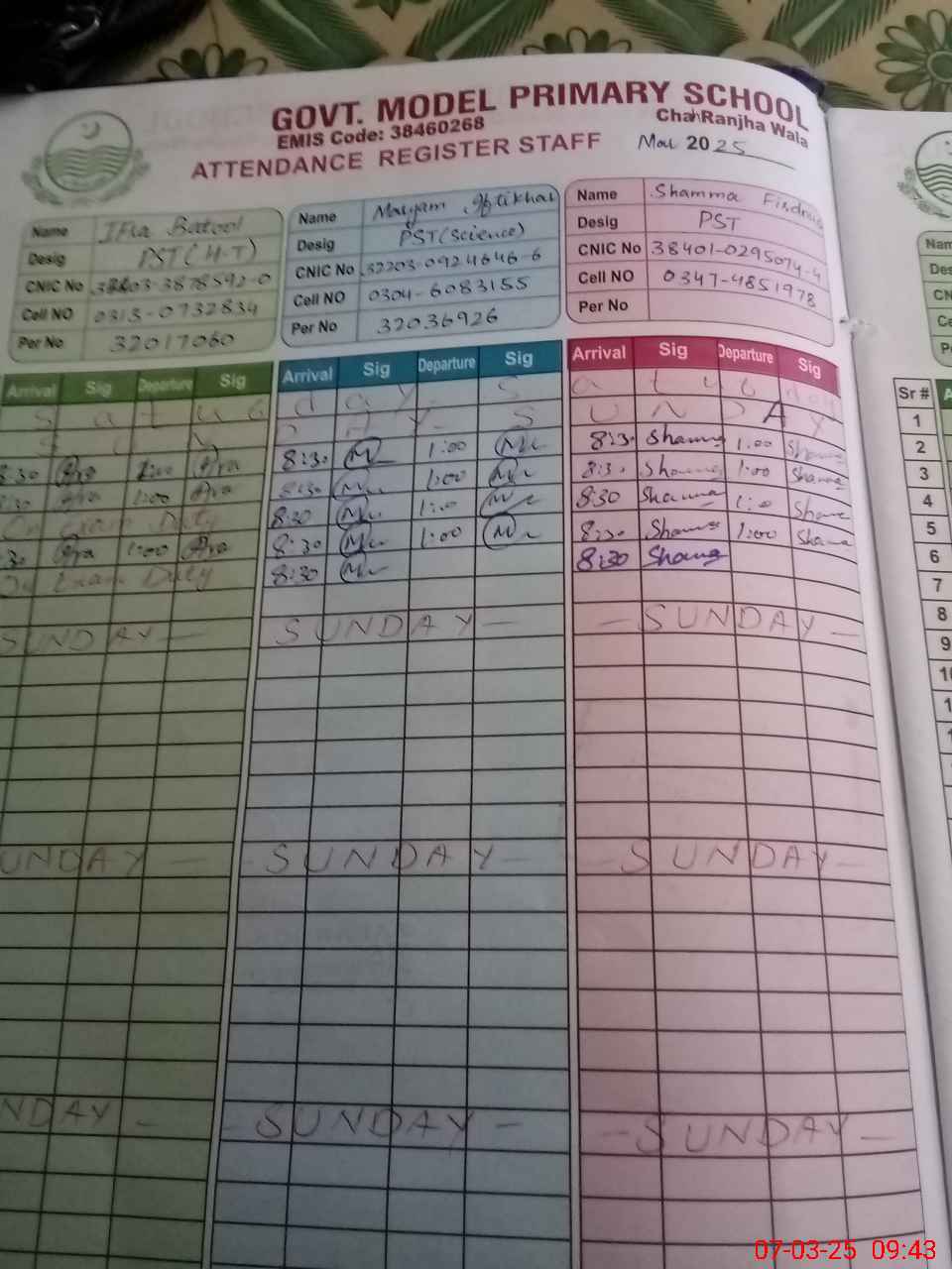 | CNIC | Full Name | Designation | R/C | Absence during last cal. month |