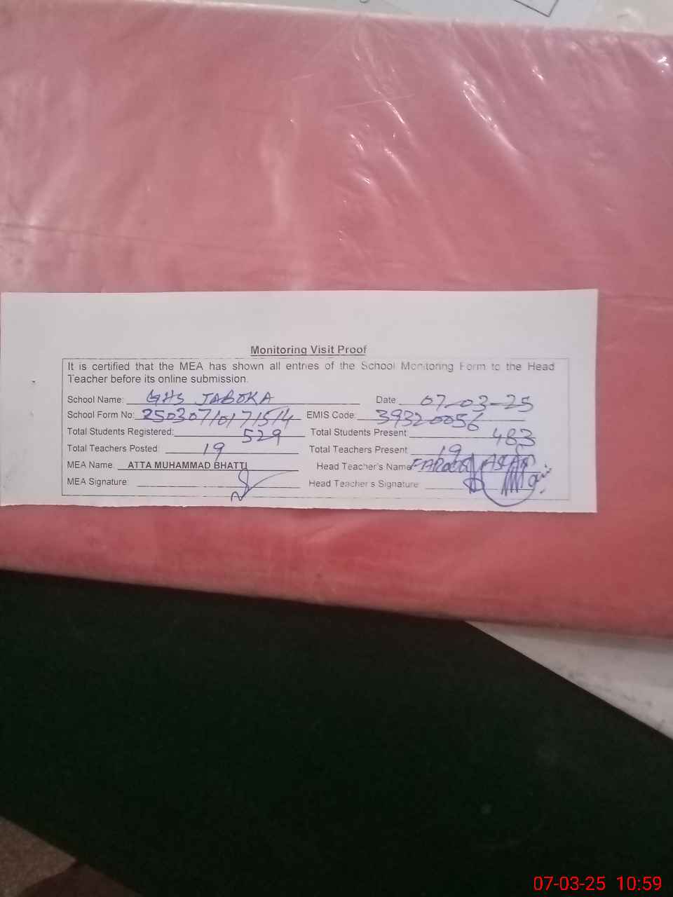 | Certified that this School was Inspected by the Undersigned MEA/DMO Today and the Information Stated Above is as Per Record. | |||||