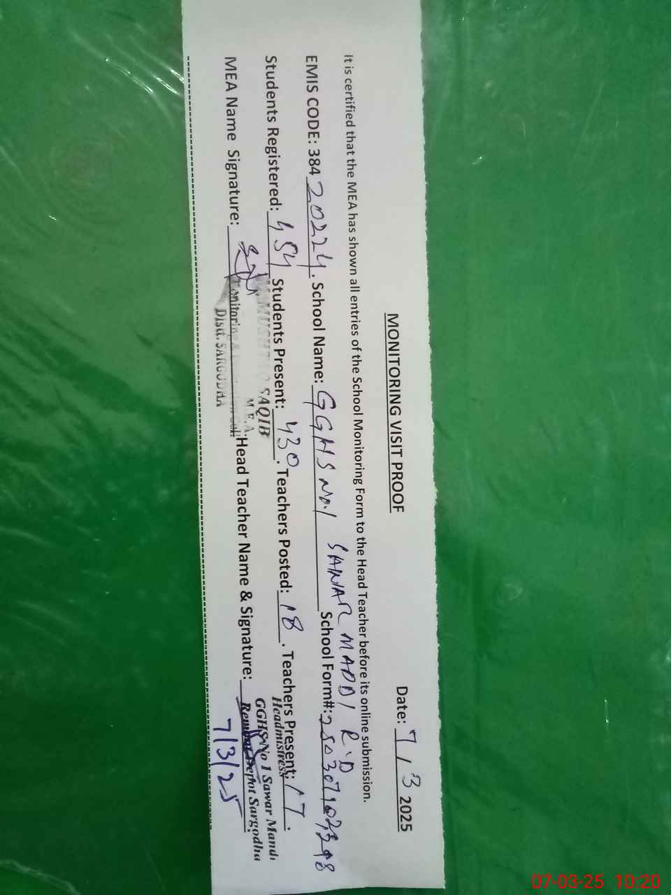 | Attendance Register | Head Teacher | MEA with School | Visit Proof |