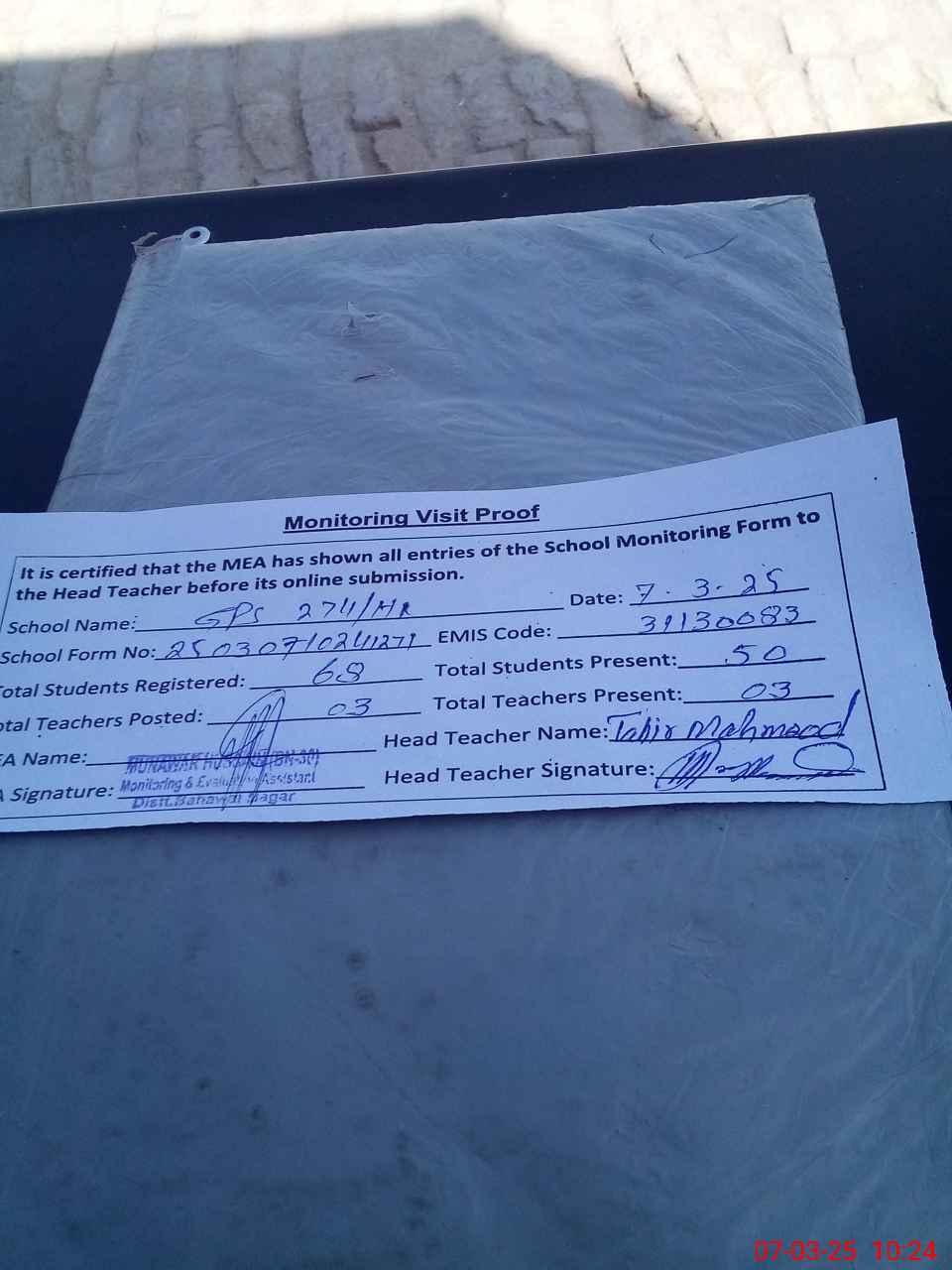 | Attendance Register | Head Teacher | MEA with School | Visit Proof |