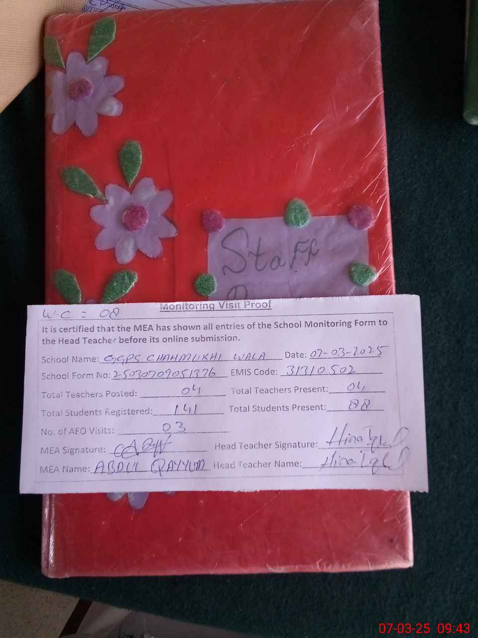 | EMIS Code: 31310502 | Name of School: GGPS CHAHMUKHI WALA | |||