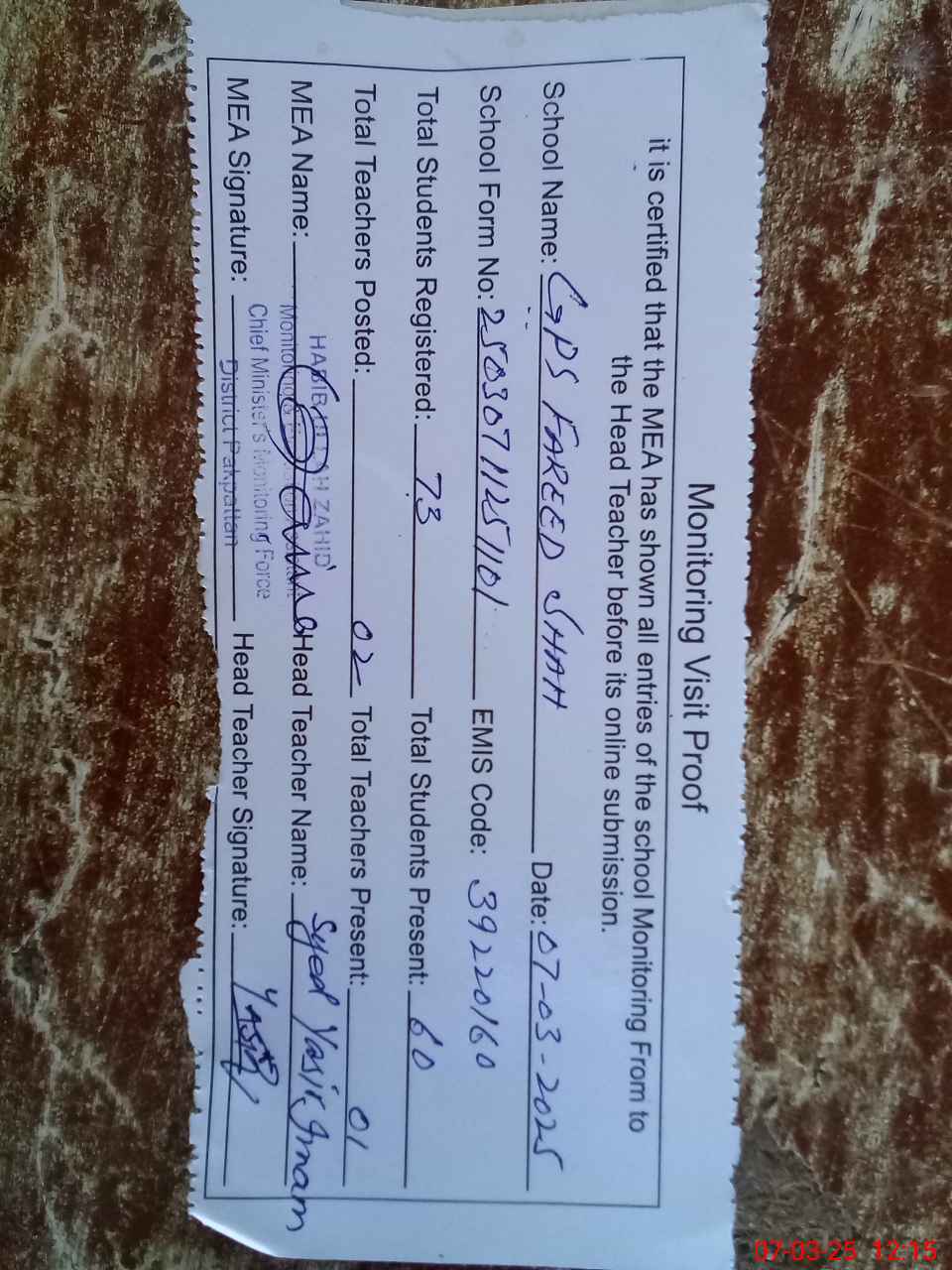 | Certified that this School was Inspected by the Undersigned MEA/DMO Today and the Information Stated Above is as Per Record. | |||||