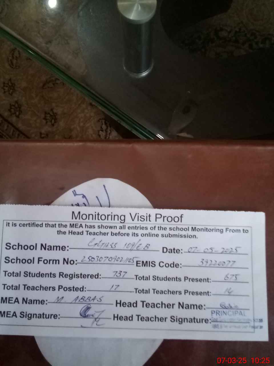 | Monitoring Date: 07-03-2025 | Start Time: 07-03-2025 09:02 AM | End Time: 07-03-2025 10:25 AM | Name of MEA: Mu**** Ab**** | |