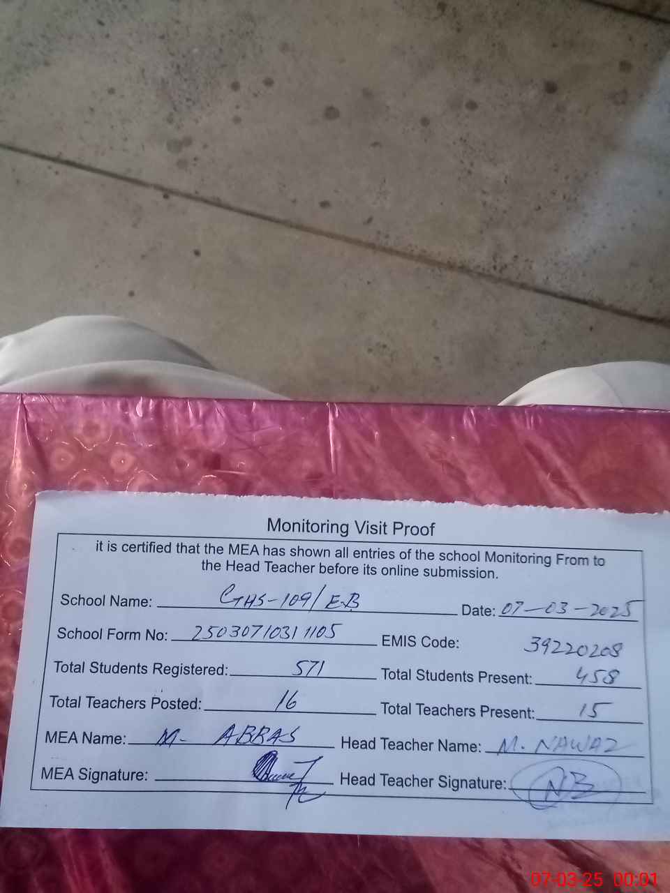| EMIS Code: 39220208 | Name of School: GHS CHAK NO. 109/ EB | |||