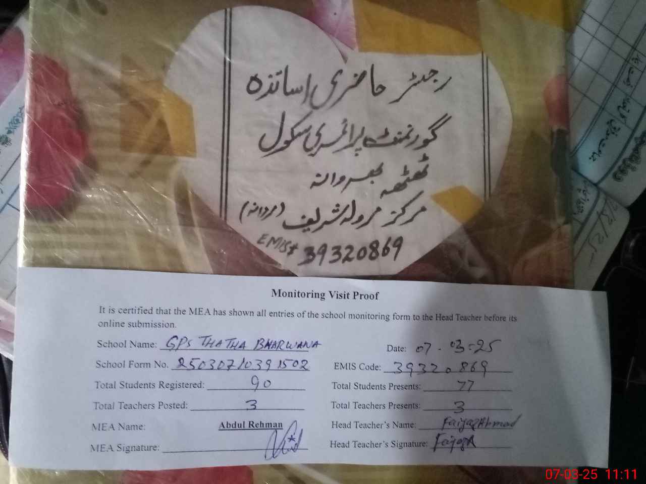 | Attendance Register | Head Teacher | MEA with School | Visit Proof |